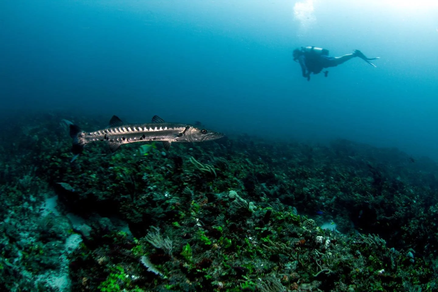 First drop on captain Kirles, beautiful 60 foot viz, 84 degrees on the bottom, and a moderate north current. We spotted some reef and nurse sharks, bunch of schooling barracudas, green and hawksbill sea turtles, and a couple huge Goliath groupers! Second drop on Loggerhead. Similar conditions, loads of Caribbean reef sharks! Also dropped on the huge school of spadefish again! We spotted some Goliaths, loggerheads, and a bunch of hogfish!
