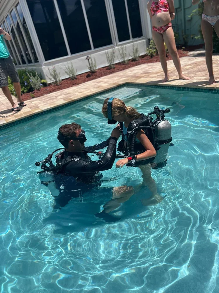 This is real scuba gear, real tanks, and real PADI-certified instructors running a guided underwater experience in your private pool.